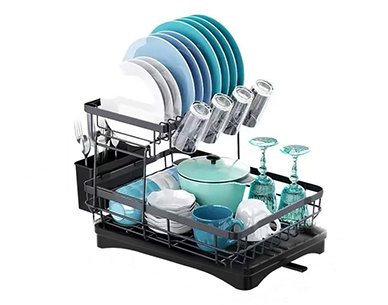 یک قفسه ظروف براق از جنس استنلس استیل به طور منظم روی یک میز کوارتز سفید در آشپزخانه مدرن مینیمال قرار گرفته است. قفسه دو طبقه به محفظه های جداگانه...